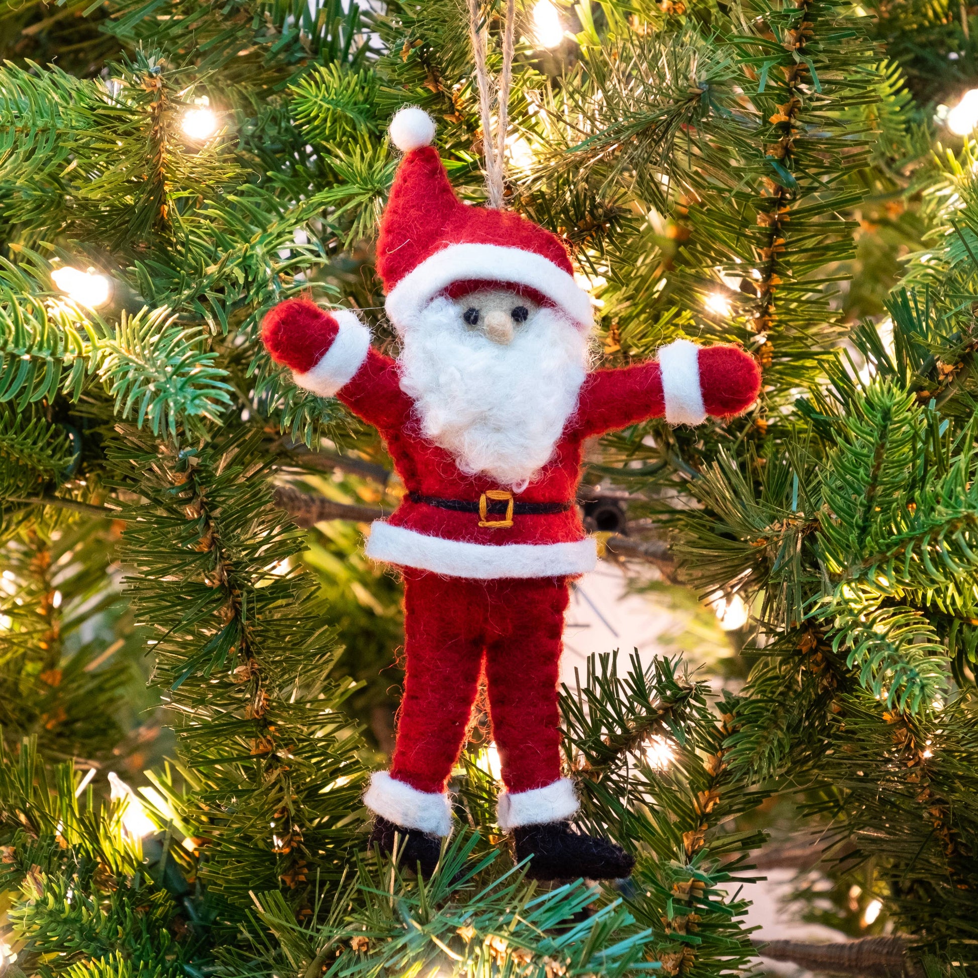 Dancing Santas add some cheer to your holiday tree. Unique ornaments for a holiday tree, to tie onto beautifully wrapped gifts or hang on cupboard knobs. Made from 100% natural wool; no harsh chemicals are used during production.